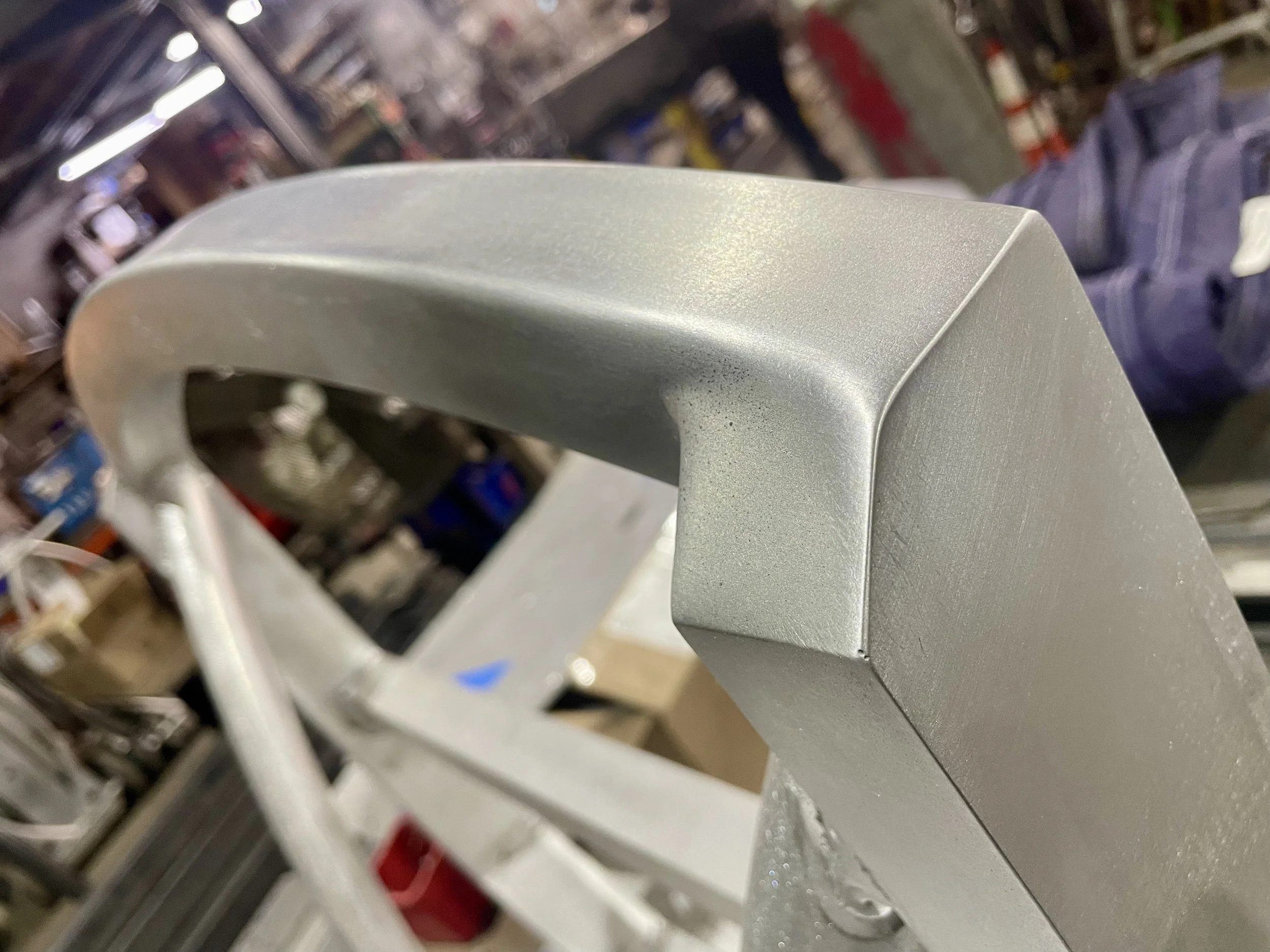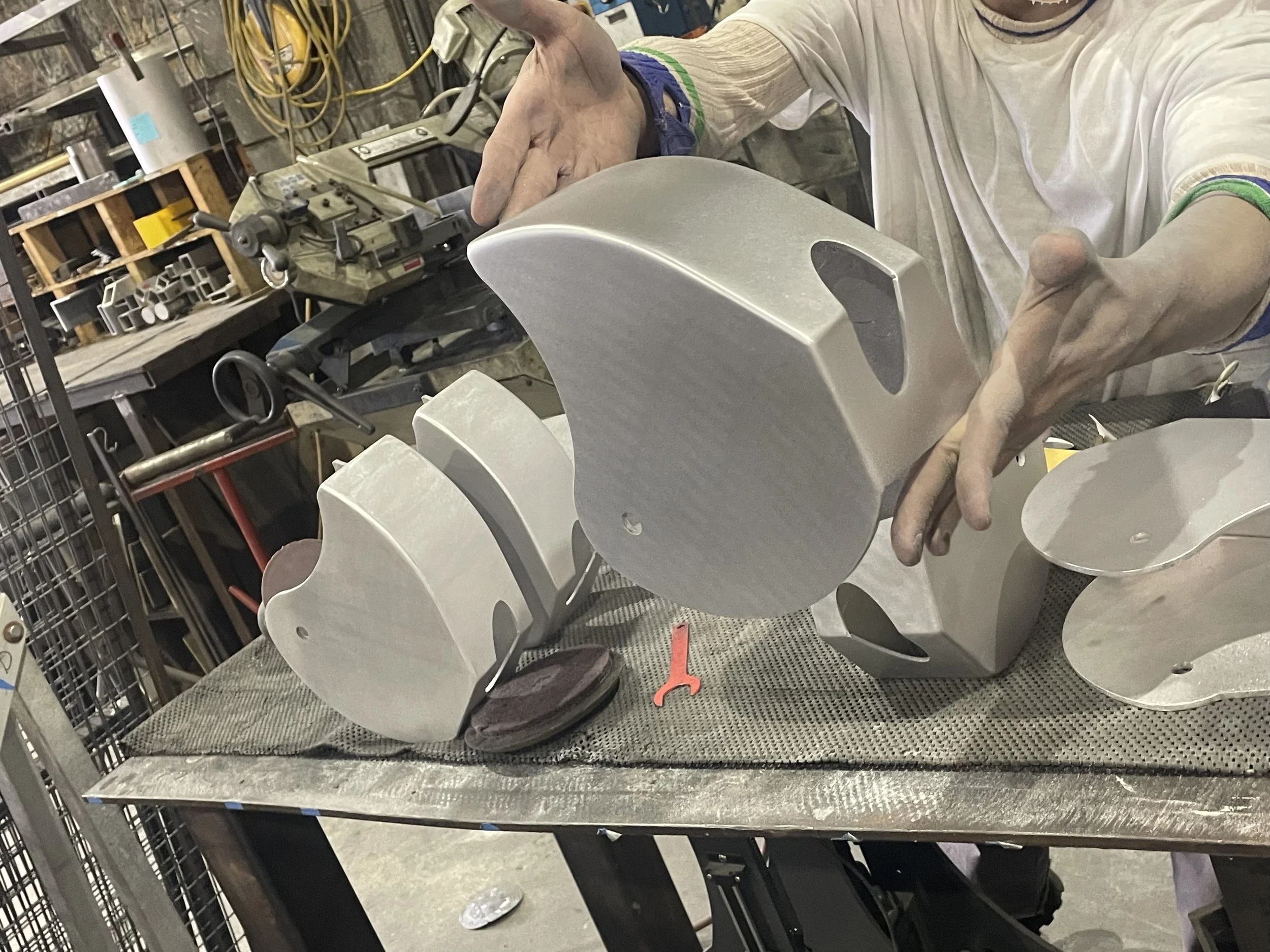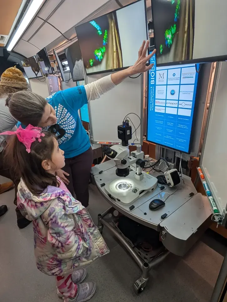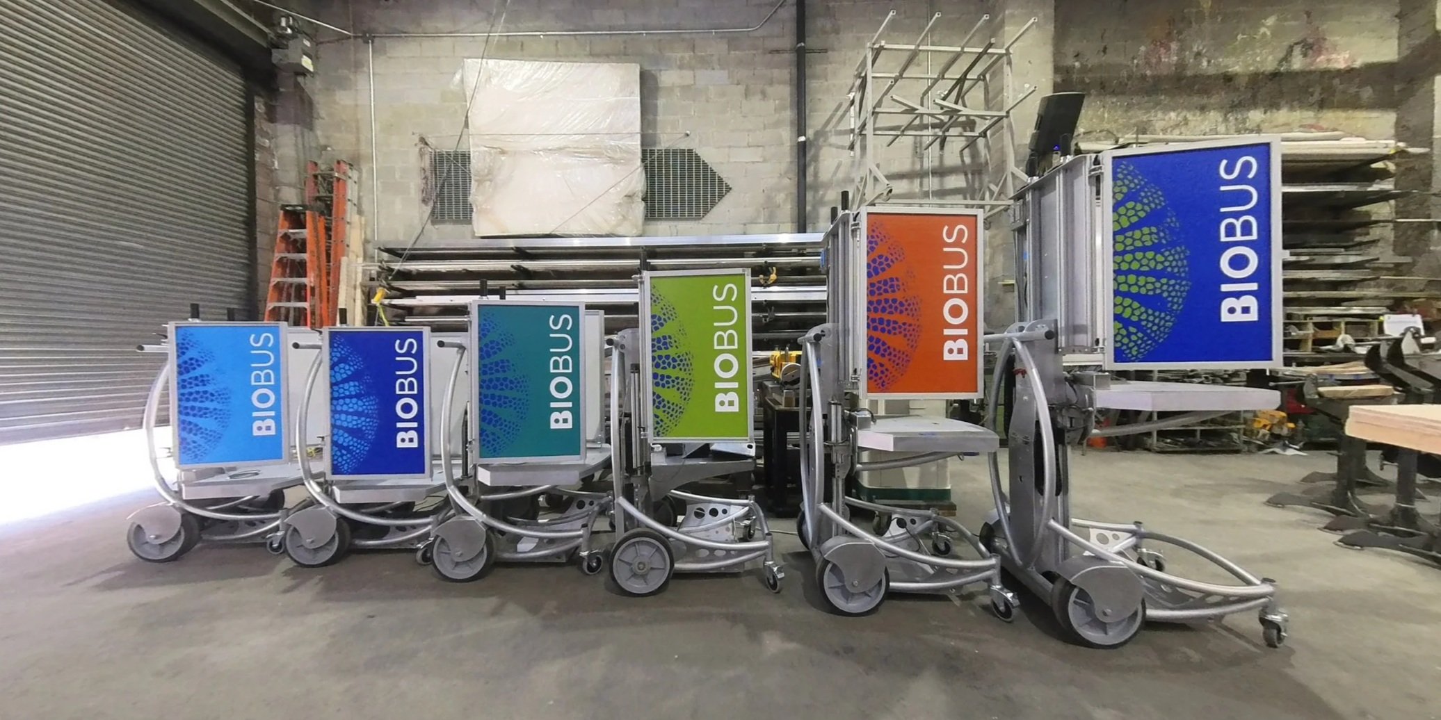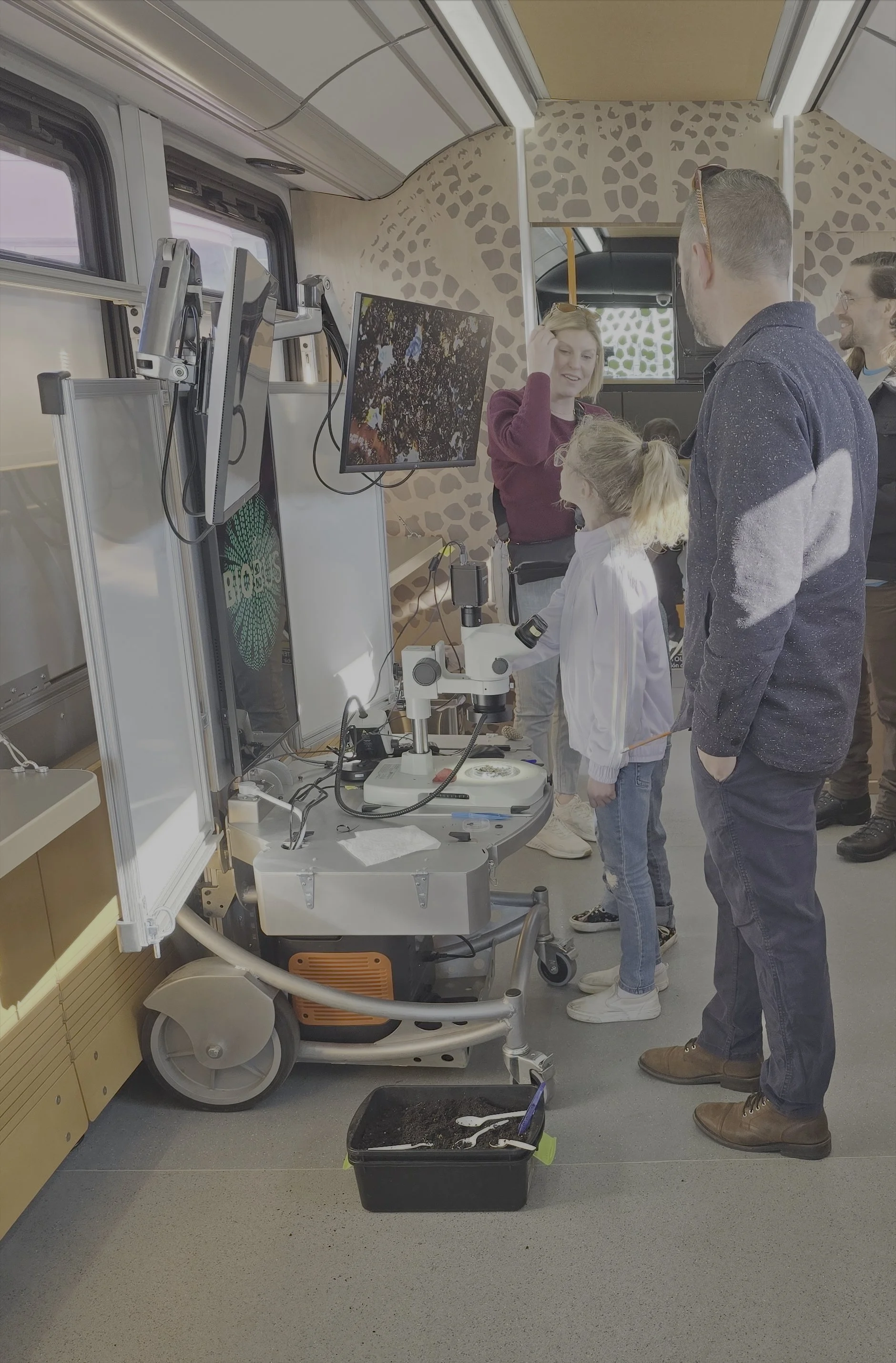 These mobile microscope stations for BioBus introduce kids to science through the microscopic world. Remote-controlled motors adjust both the platter and back panel to accommodate students of various ages. Note the curves and futuristic look, requiring precise bends and complex coping. We are proud to contribute to this educational project.